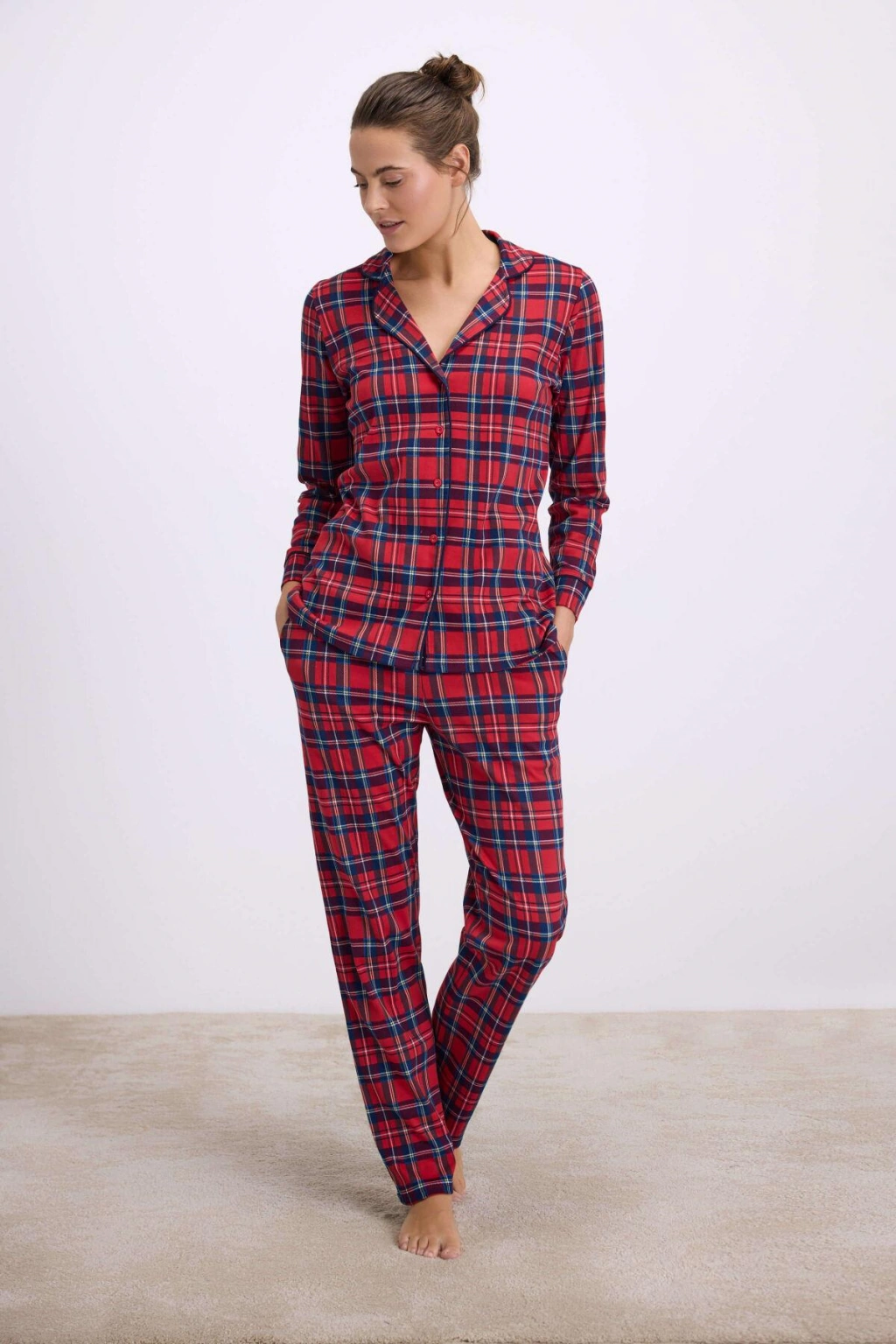 Düğmeli uzun kol gömlek, zamansız ve şık tasarımıyla hem rahat hem de modern bir görünüm sağlarken; ekose desenli pantolon, rahat kesimi ve esnek bel yapısıyla özgür bir hareket alanı sunar. Hem uyku hem de ev keyfi için ideal bir kombinasyon oluşturur.