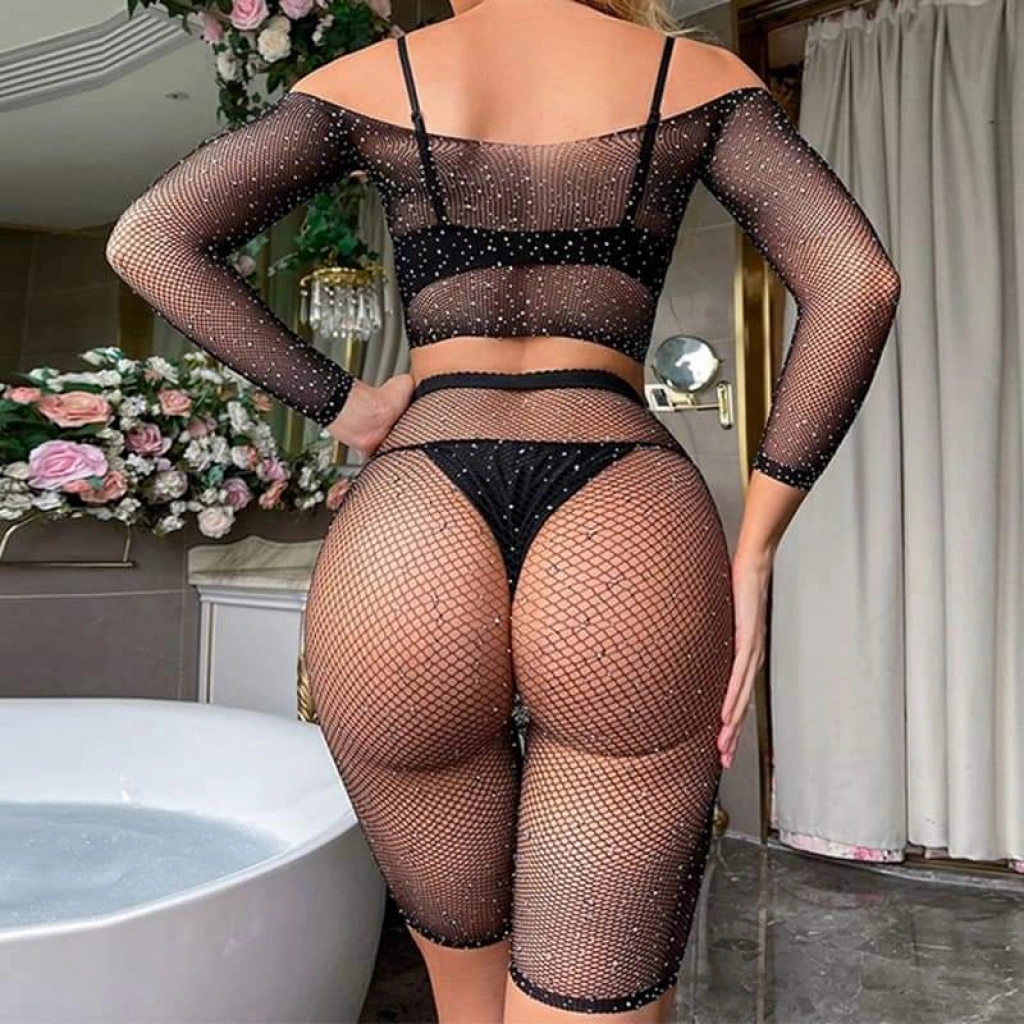 • 2 Parça Taşlı Omuzları Açık Crop- Şort Vücut Çorabı