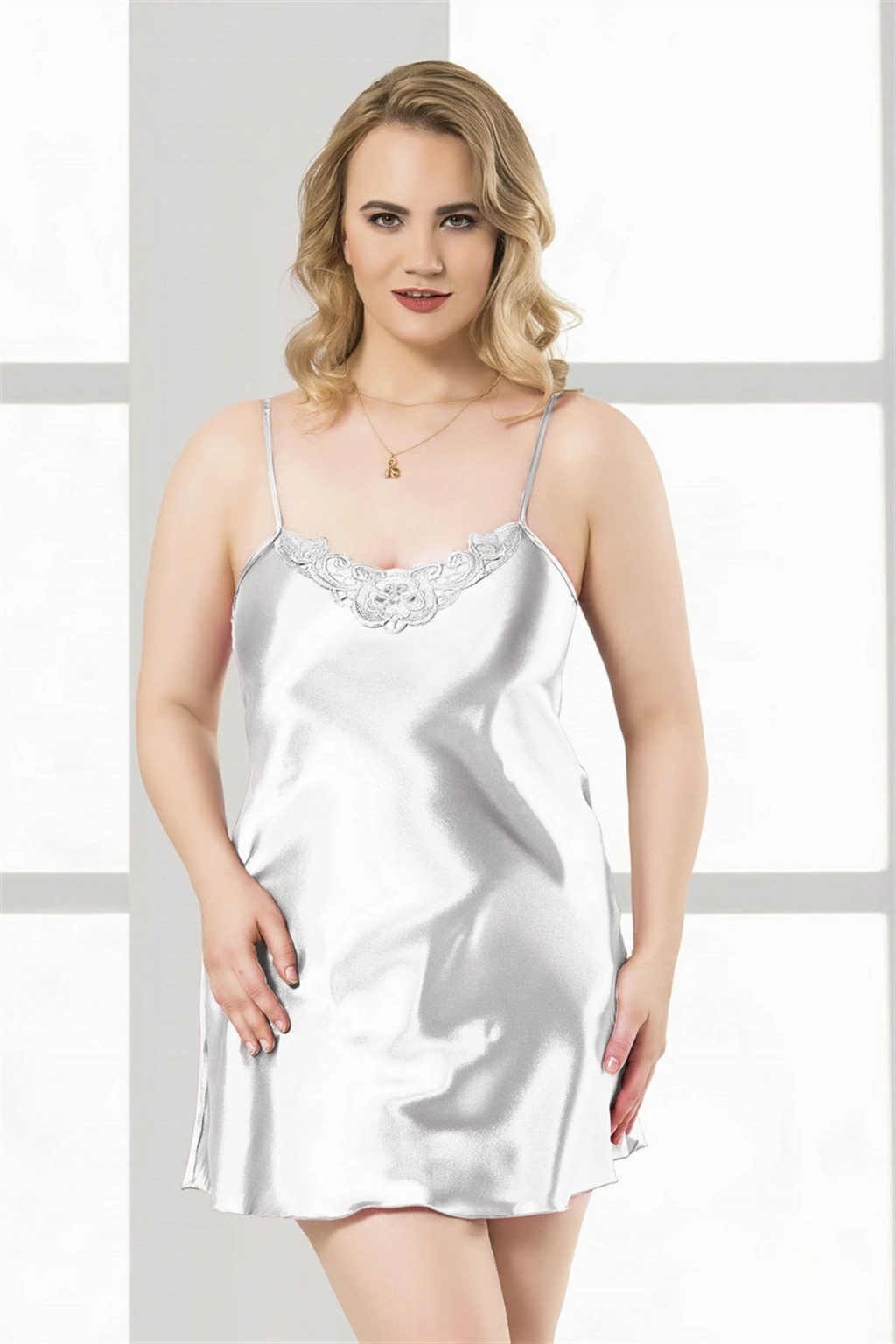 Büyük Beden Beyaz Kısa Saten Gecelik