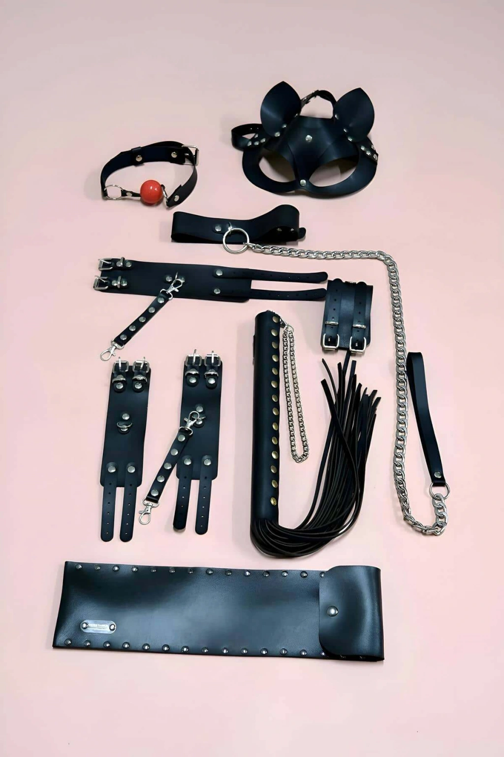• Ürün ve paket içeriği: 6 parça (Kırbaç ve kırbaç kılıfı, el kelepçe takım, ayak kelepçe takım, tasma, ağız topu ve kedi maske )
