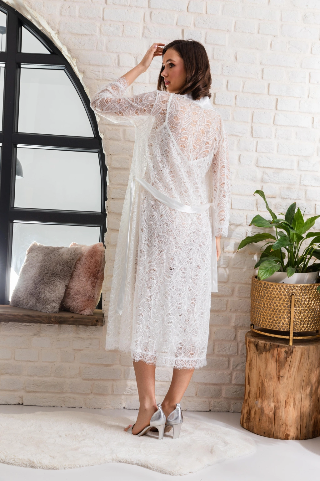 Gelin Set Transparan Midi Boy Kuşaklı Sabahlık Ekru (mgp12176)
