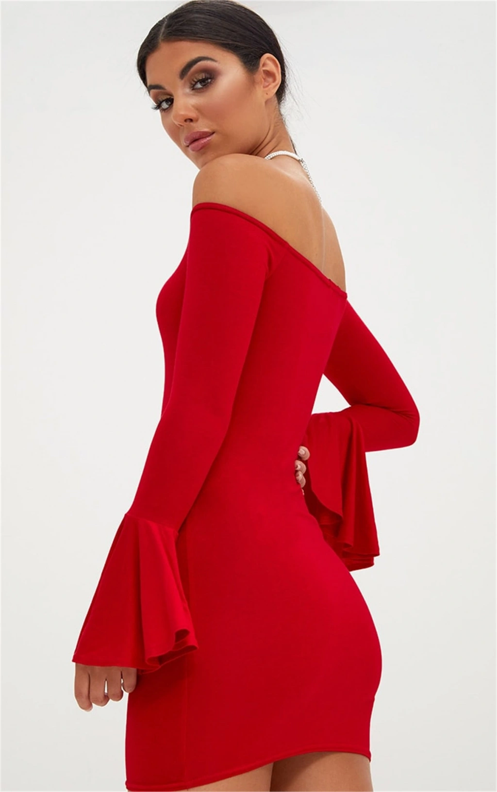 Giyim Kırmızı İspanyol Kol Dar Elbise