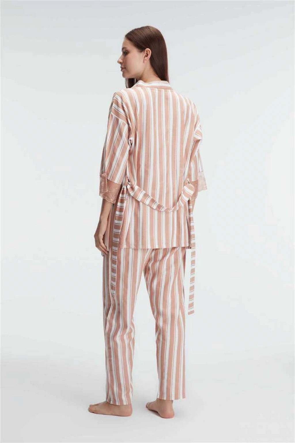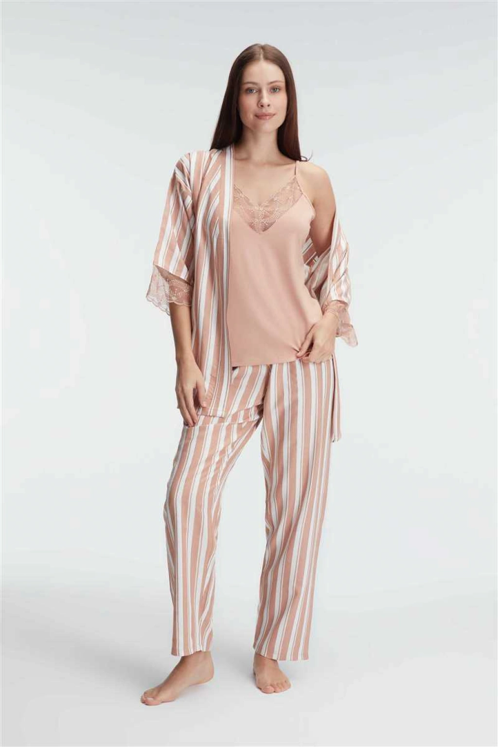5821 Günlük Basic Ev Giyimi İp Askılı V Yaka Kadın Viskon Çizgili Desenli Yazlık Örme Normal Bel Uzun Diz_Altı Uzun Paçalı Pijama Takımı Sabahlık modelimiz