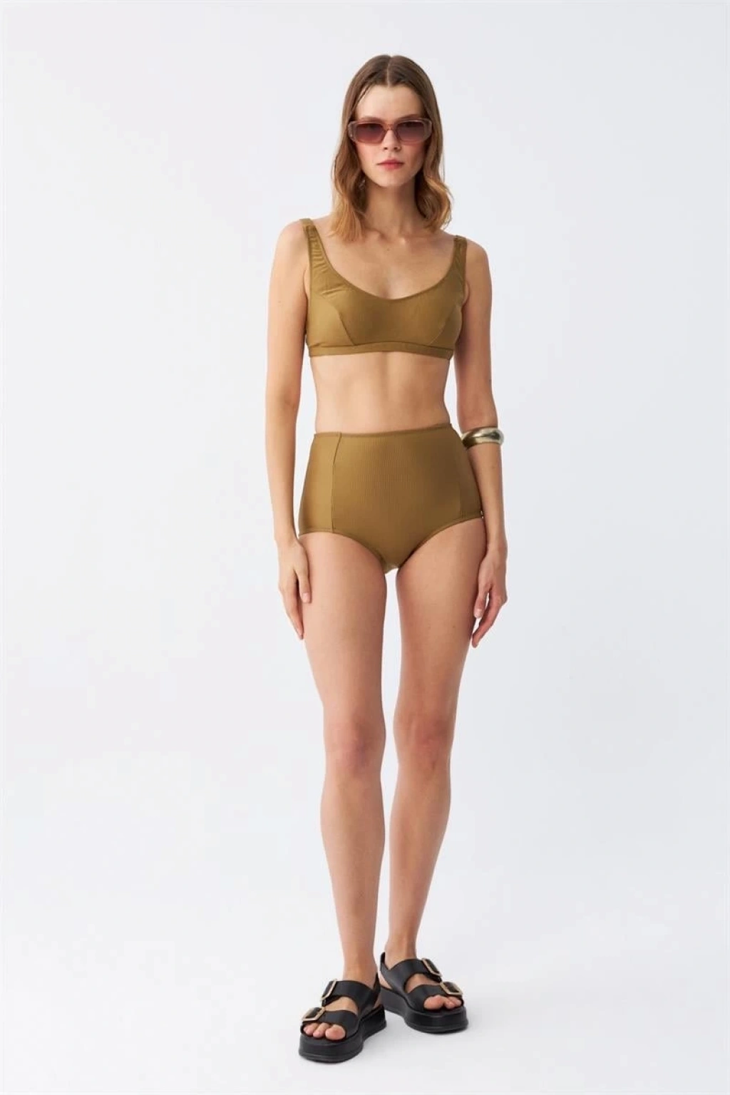 Yaz aylarının vazgeçilmezi olmaya aday Kadın Basic Hardal Pedli Yüksek Bel Bikini Takımı, plaj kombinlerinizi tamamlayacak.
