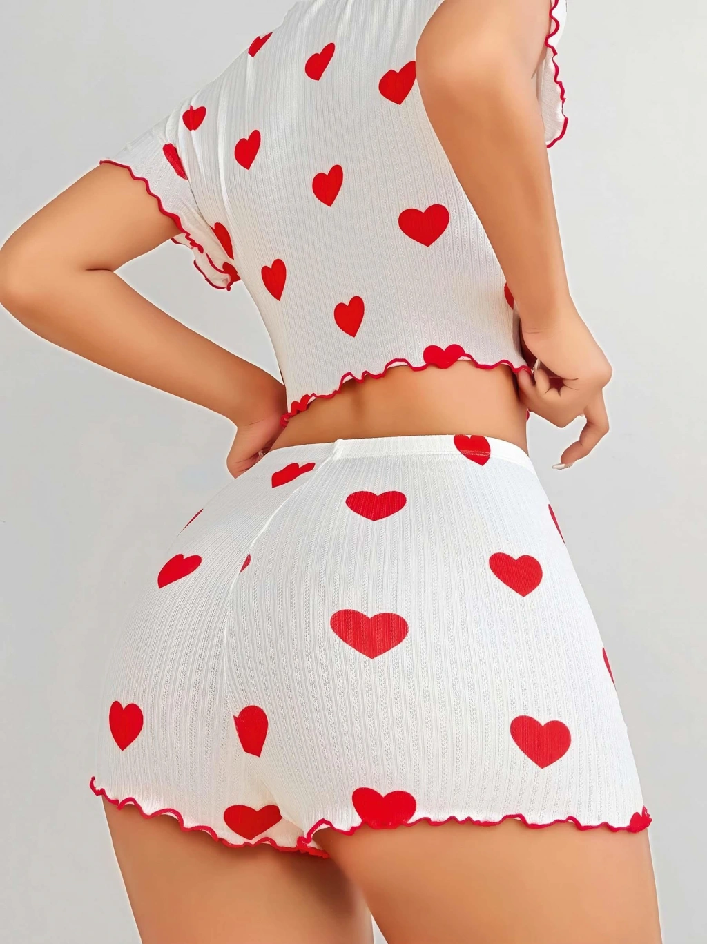 Beyaz kalp desenli şortlu gecelik takımı, eğlenceli ve dikkat çekici bir tasarıma sahiptir. Hafif kumaşı ile rahat kullanım sunarken enerjik bir stil yaratır.