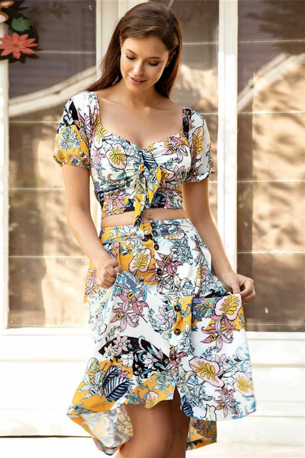 Kısa Ad:Kadın Dokuma Önden Bağlamalı Çiçek Baskılı Omuzu Düşük Büstiyer ve Önden Düğmeli Etek Takım (9658)