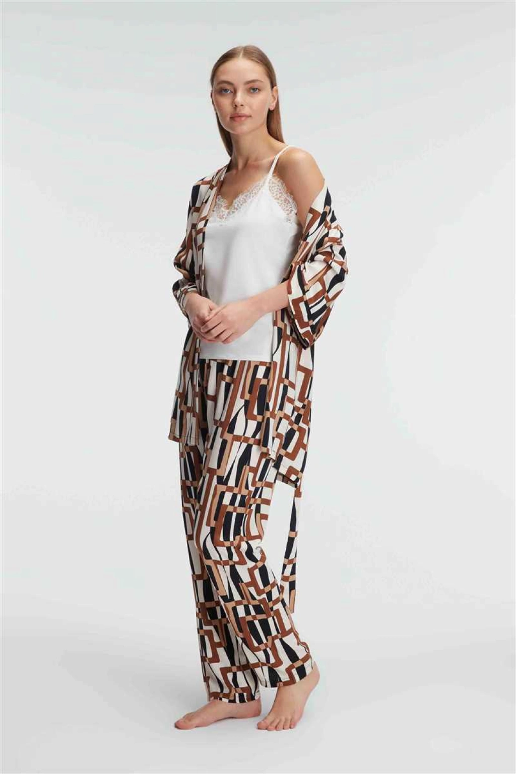 Kadın Dokuma Viskon Geometrik Baskılı Sabahlık Mikro Kumaş Dantelli Atlet Ve Yandan Cepli Pantolon 3'lü Takım