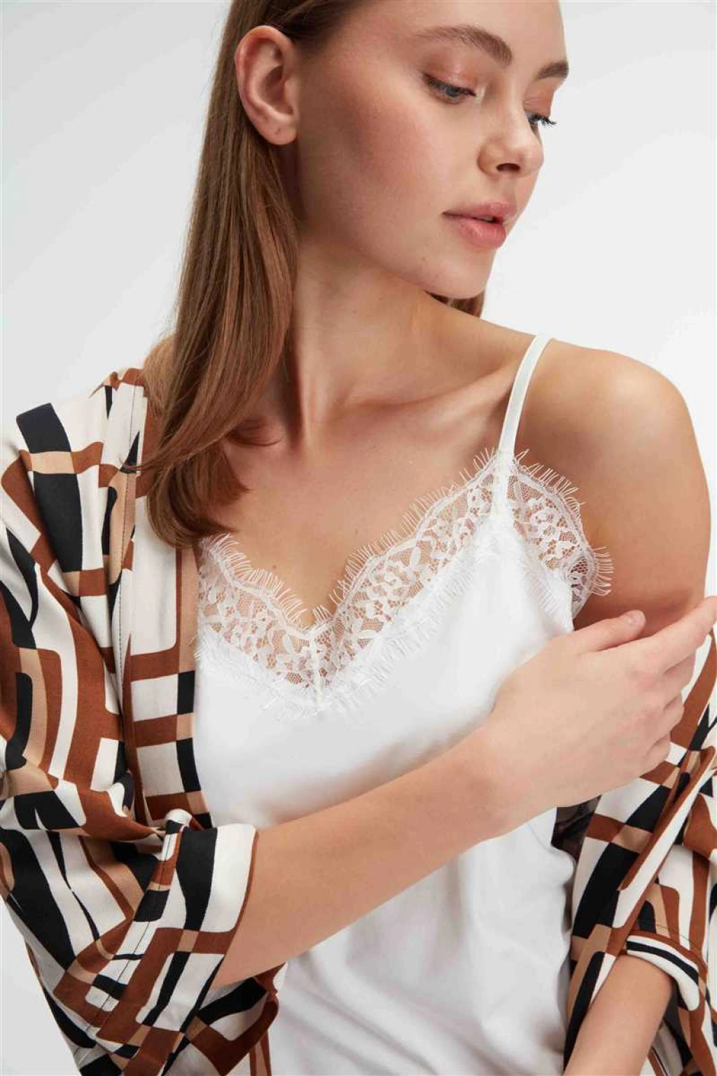 5704 Günlük Basic Ev Giyimi İp Askılı V Yaka Kadın POLYESTER Geometrik Yazlık Dokuma Normal Bel Uzun Diz_Altı Dantel Detaylı Pijama Takımı Sabahlık
