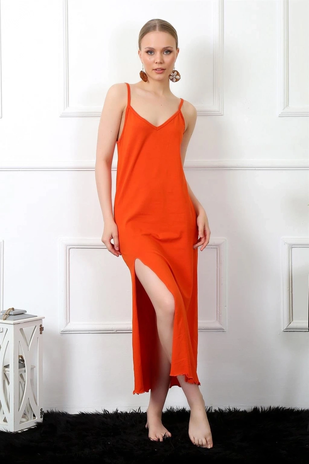Bir kadının zarafetini ve şıklığını yansıtan Çamaşır Kenti marka ip askılı Turuncu uzun gecelik, rahat ve şık bir seçenektir.