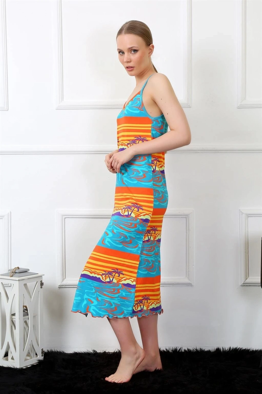 Çamaşır Kenti'nin mavi ip askılı uzun geceliği, hem şık hem de rahat bir seçenektir. İnce ip askıları ve dantel detaylarıyla tasarlanan bu gecelik, feminen bir görünüm sunar.