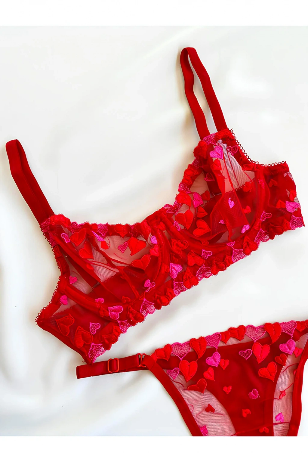 • Kadın Kalpli Kırmızı Dantelli Balenli Sütyen Külot Takım
