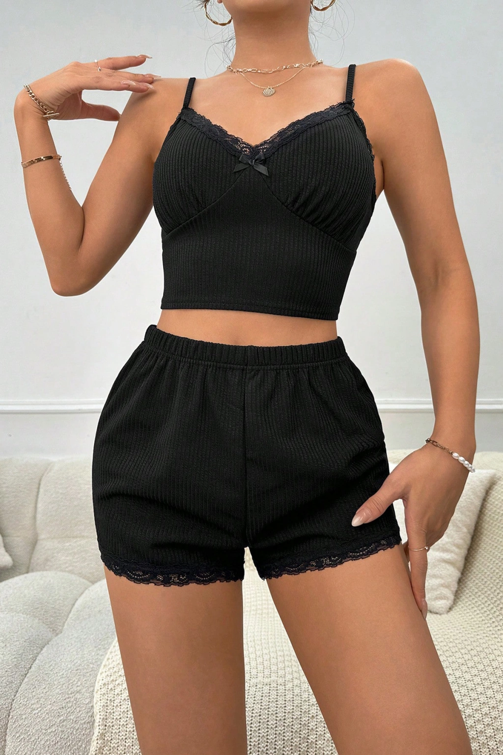 Kadın Siyah Alt Ve Üst Dantel Detaylı Fiyonklu Şortlu Gecelik Takımı