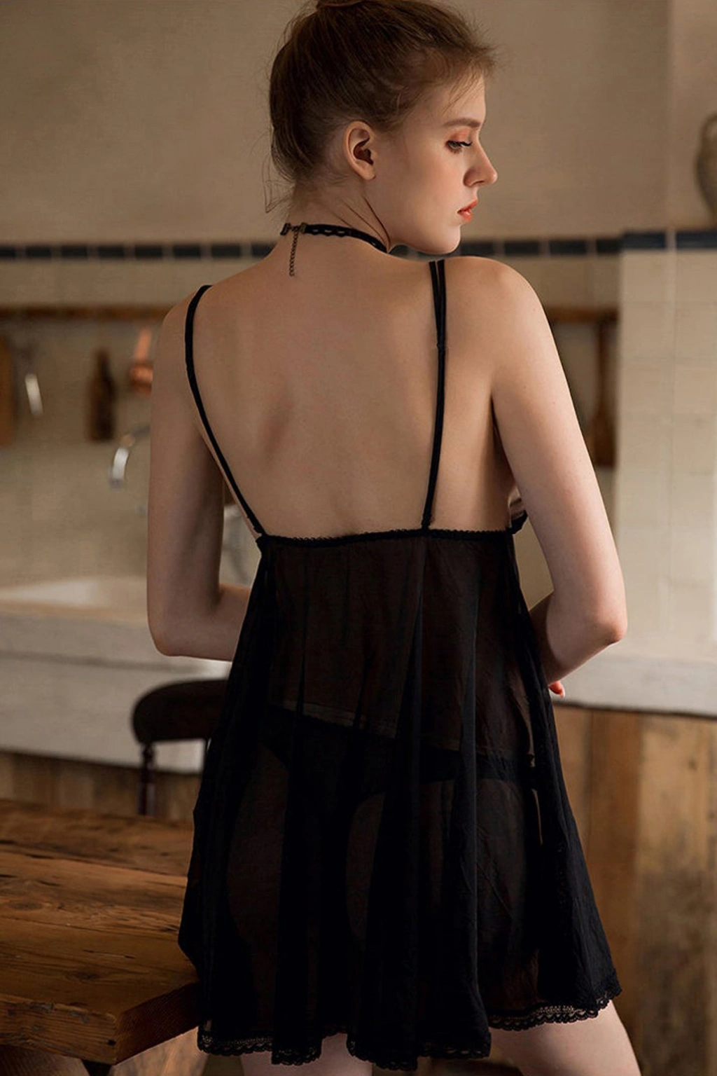 Kadın Siyah Fırfırlı Tül Detaylı Sırtı Çapraz Ve Açık Komple Dantel Gecelik