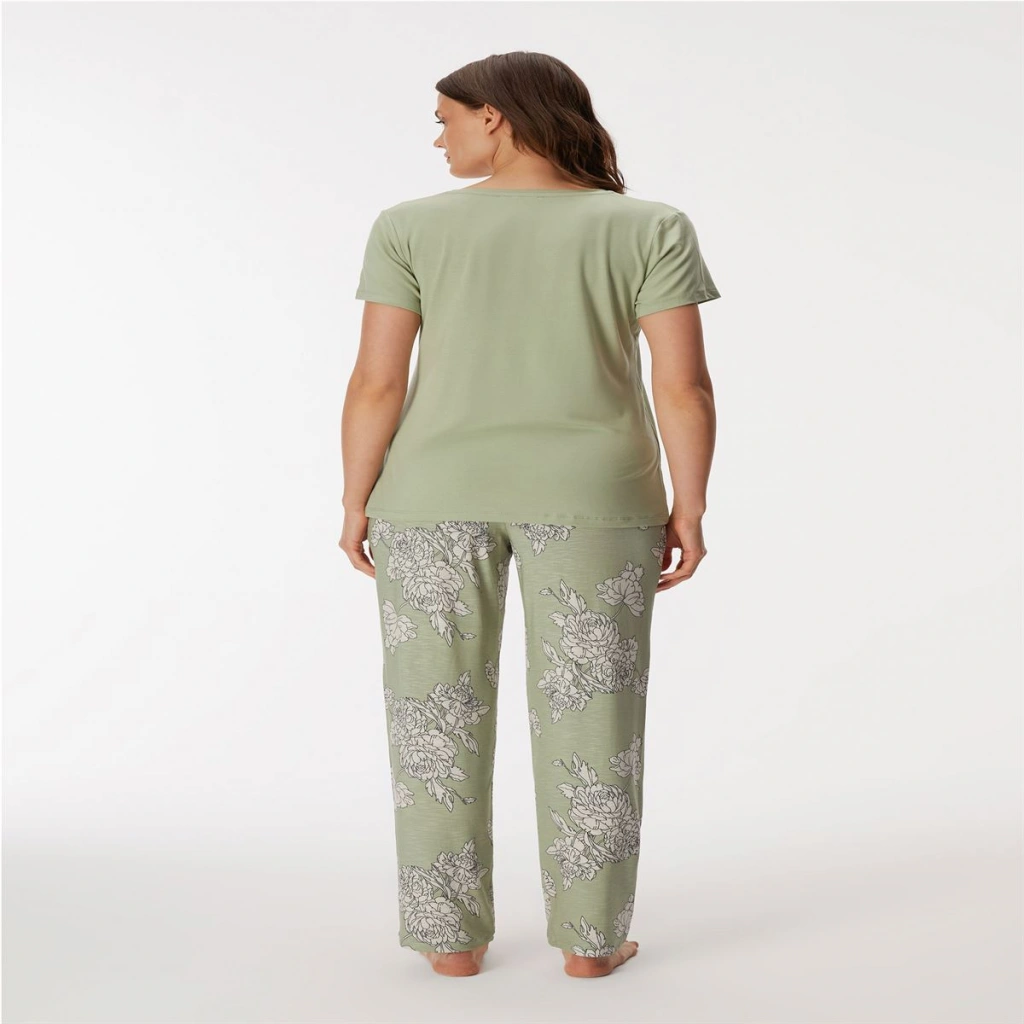 Kısa Kol Bisiklet Yaka Kadın Viskon Çiçek Desenli Yazlık Örme Dantel Detaylı Pijama Takımı