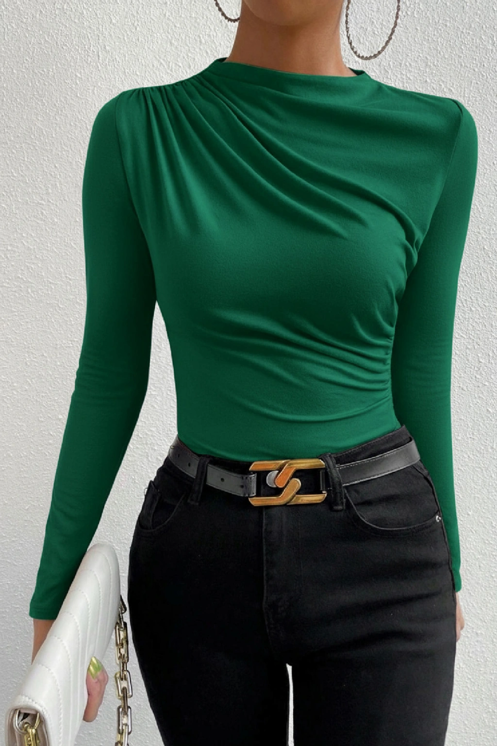 • Bel ve boyun bölgesindeki büzgü detayları, bluzu klasik parçalardan ayıran şık bir dokunuş sunar.