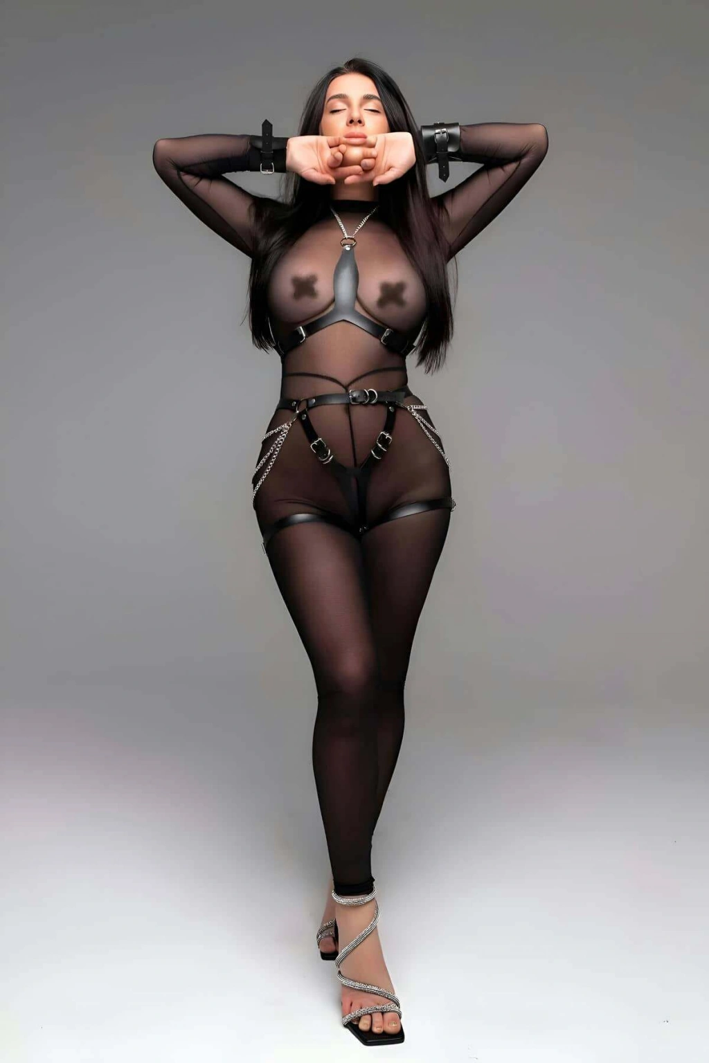 • Ürün ve paket içeriği: 4 parça (1 ad. Göğüs Harness , 1 ad. Harness Külot, 2 ad. Bileklik) Vücut çorabı dahil değildir.