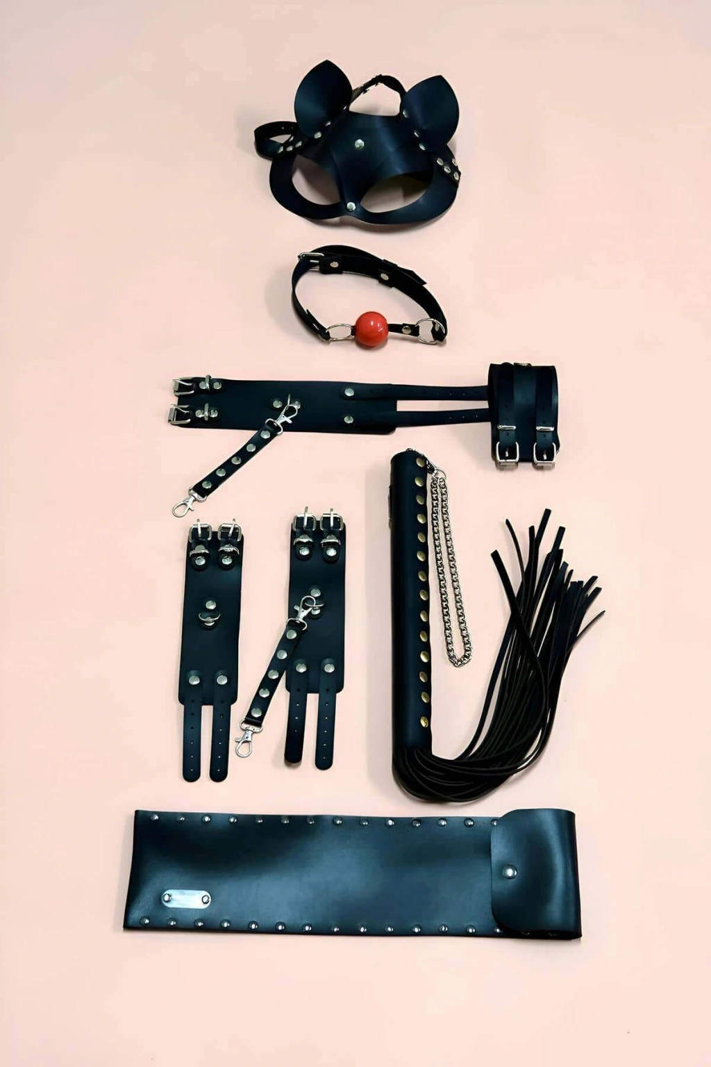• Ürün ve paket içeriği: 5 parça (Kırbaç ve kırbaç kılıfı, el kelepçe takım, ayak kelepçe takım, ağız topu ve kedi maske )