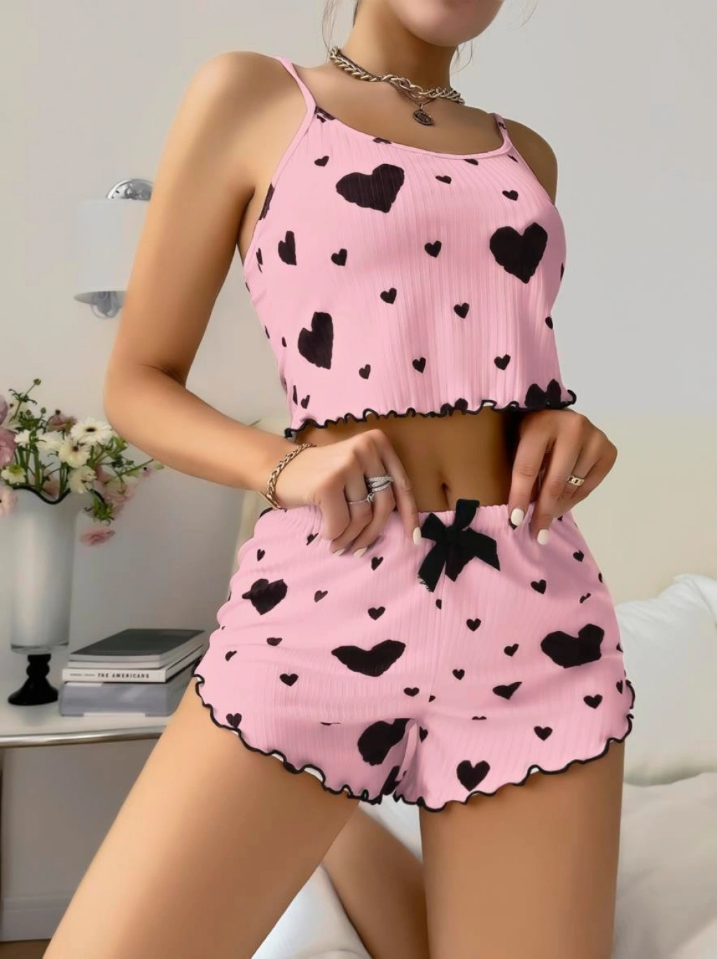 Pamuklu Pembe Üstüne Siyah Kalp Desenli Askılı Fitilli Şortlu Pijama Takımı