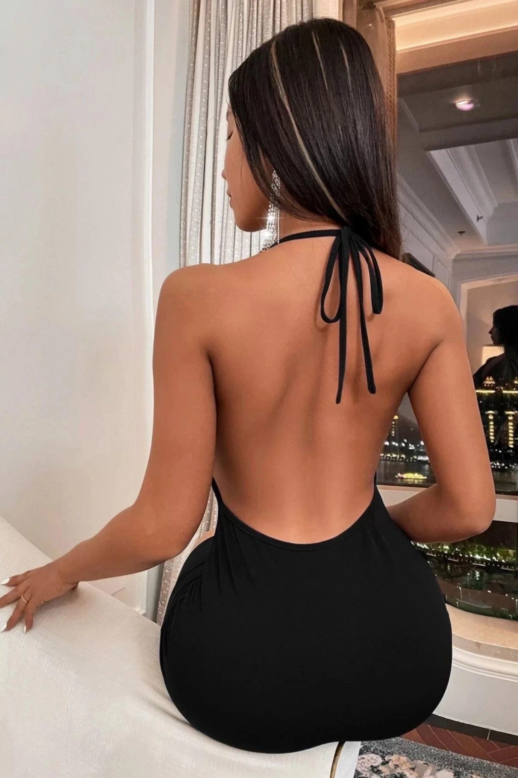 Siyah Boyundan Bağlamalı Sırt Dekolteli Mini Club Elbisesi