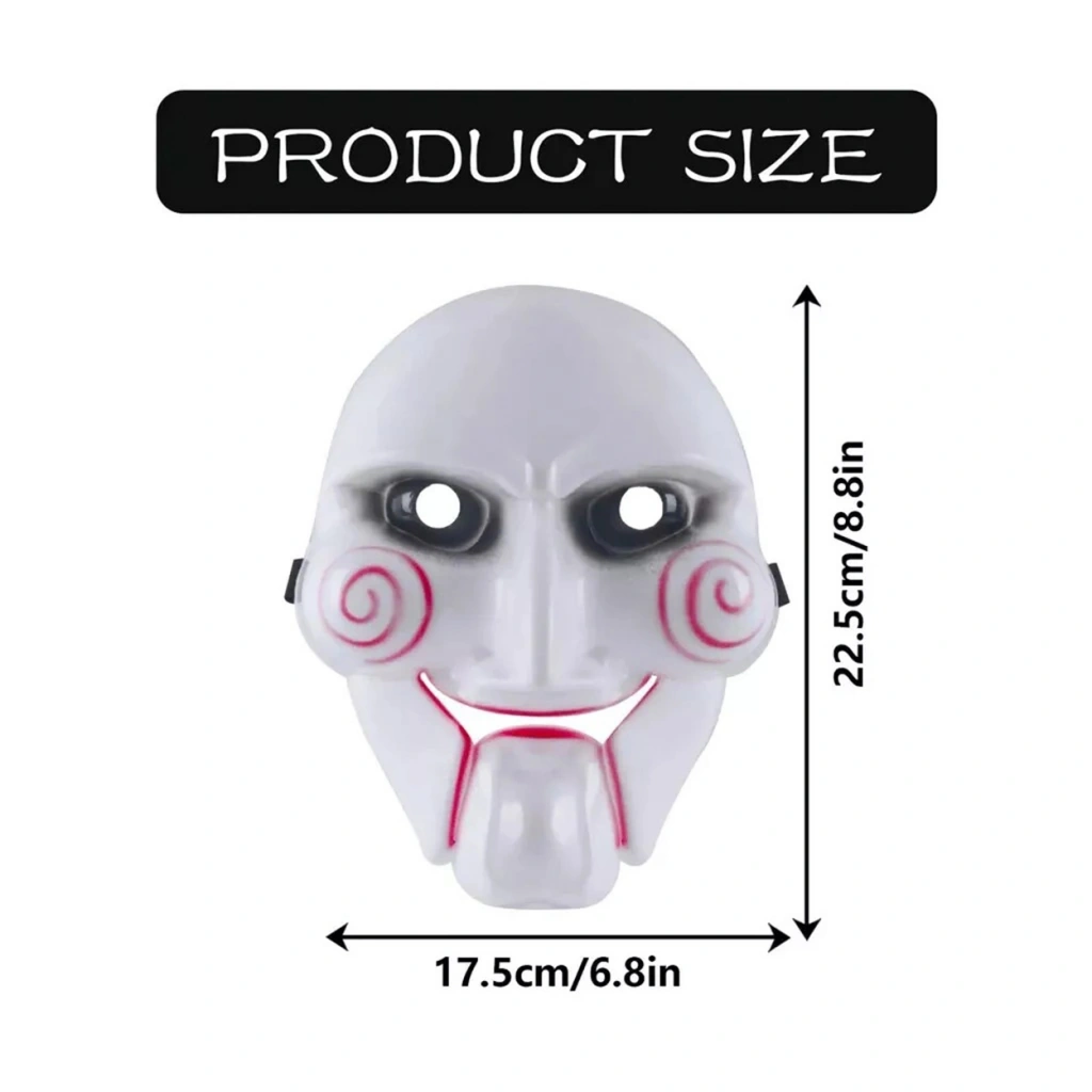 Yetişkinler ve Çocuklar için Parçalı maske siyah elastik sert plastik ve yapışması yapılmıştır. Siyah göz bölgesi, kırmızı ağız bölgesi ve yanaklarda kırmızı spirallerle beyazdır. Bu testere maskesi bir kukla kafasına benziyor, bir Cadılar Bayramı partisi için orijinal bir şekilde giyinmek için mükemmel .