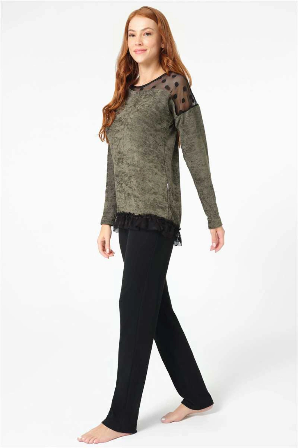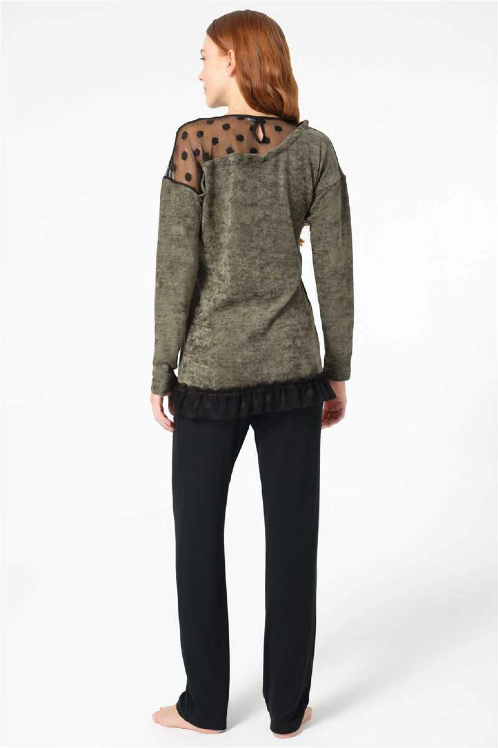 9084 Günlük Basic Ev Giyimi Uzun Kol Bisiklet Yaka Polyester Elastan düz Kışlık Örme Normal Bel Uzun Diz_Altı Uzun Paçalı Transparan Tül Detaylı Pijama Takımı modelimiz
