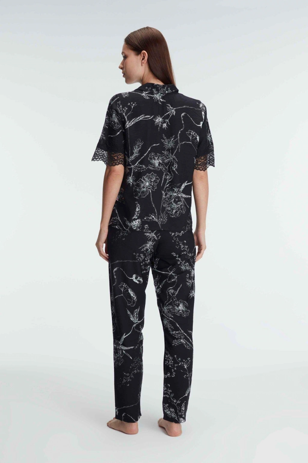 • Yarım Kollu V Yaka Kadın Viskon Çiçek Desenli Yazlık Dokuma Dantel Detaylı Pijama Takımı