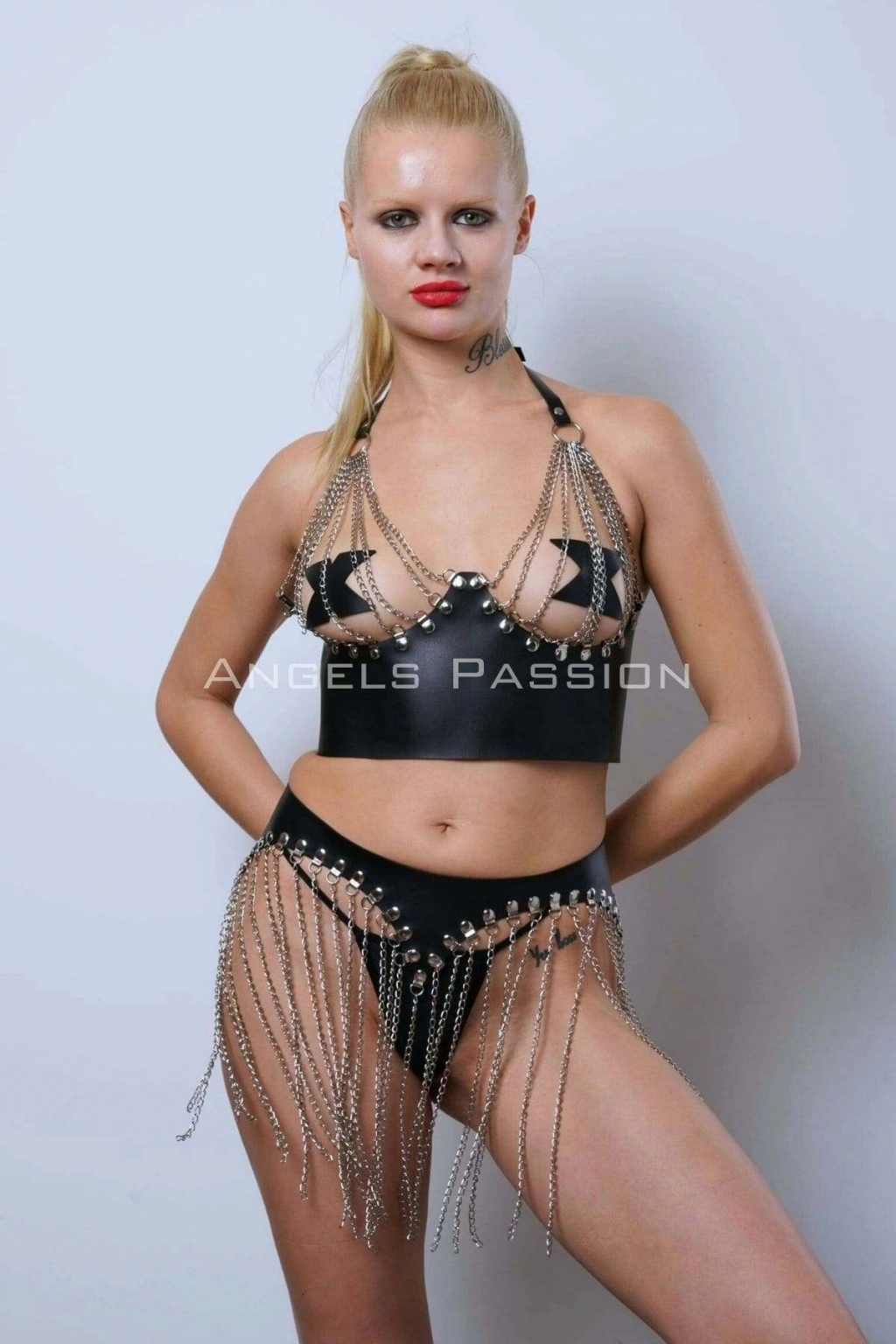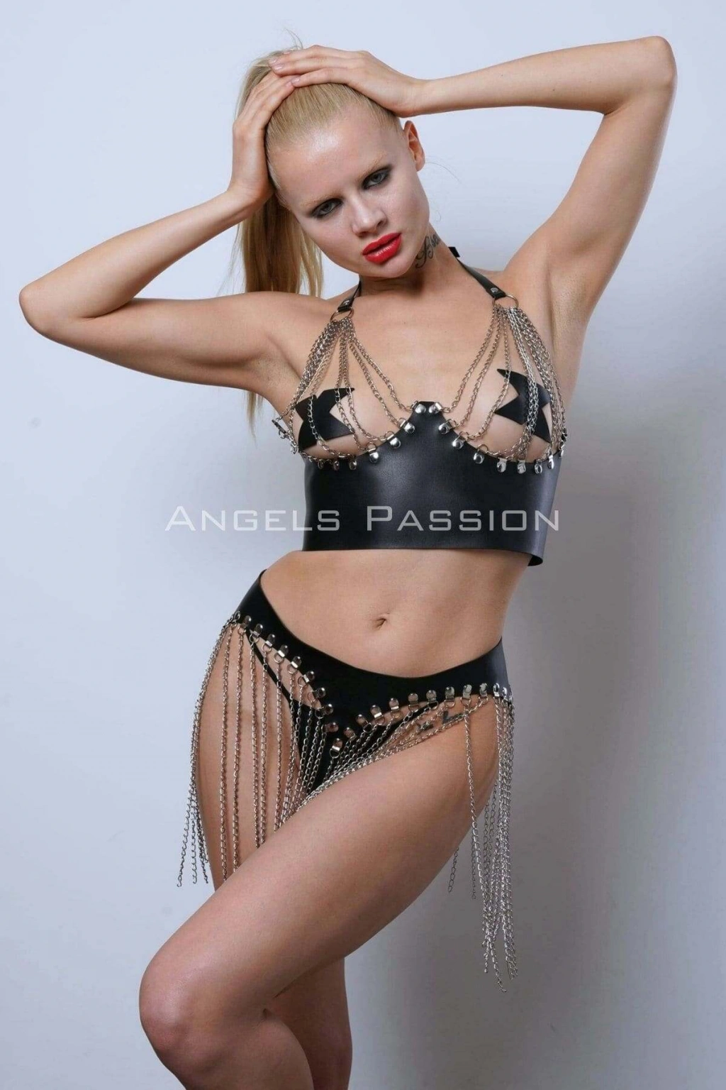 Zincirli Büstiyer Etek Takım, Şık Deri Etek Ve Büstiyer - Brf994